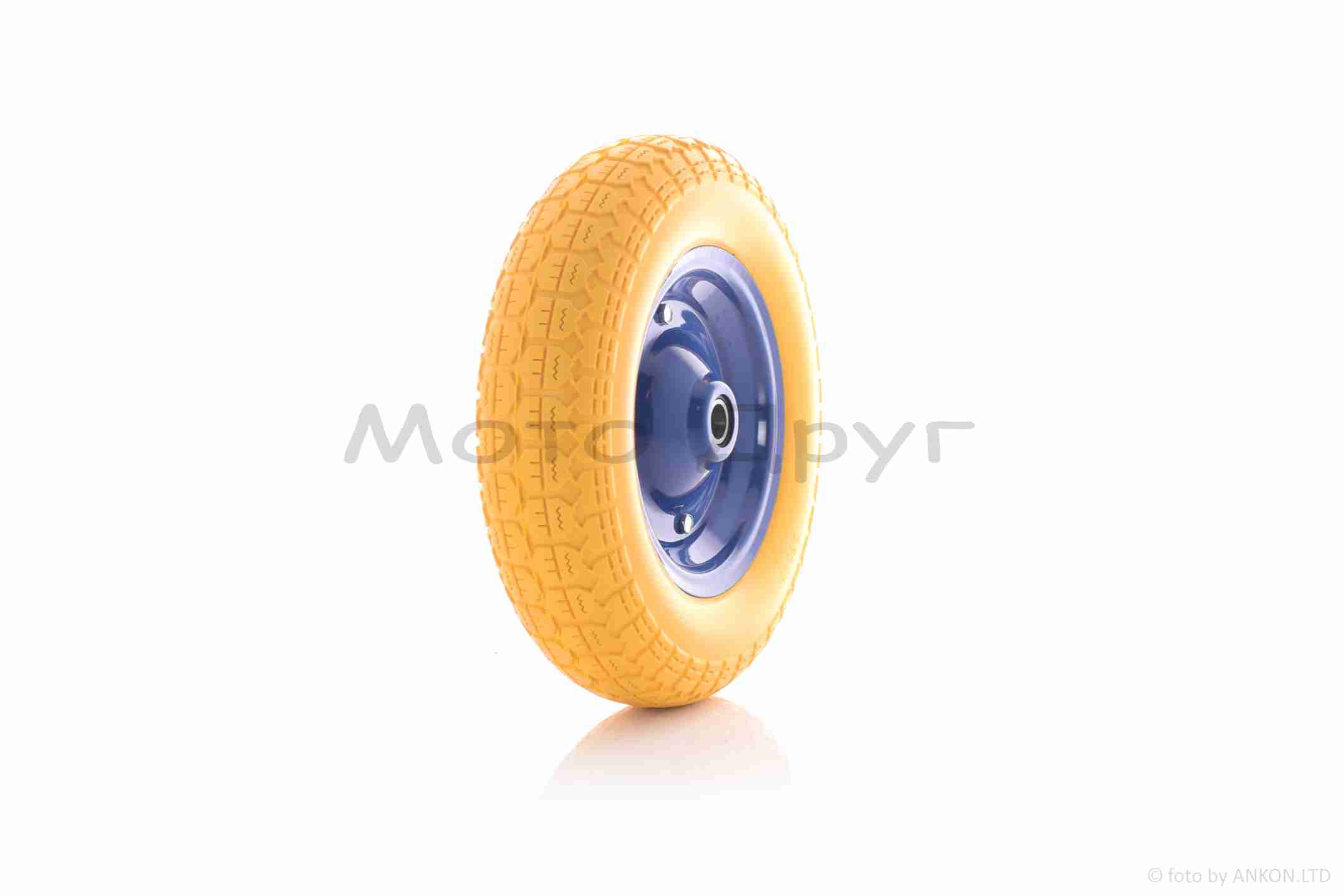 Колесо для тачки у зборі 3.50-7 (поліуретанове, жовте, синій диск, підшипник 6204 Ø20)