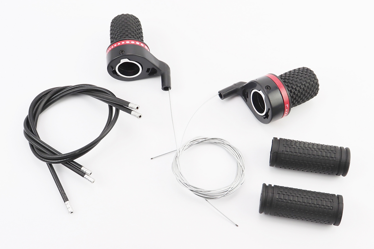 Перемикачі (грипшифт) 3×7 швидкості+рукоятки керма+троса, чорно-червоні