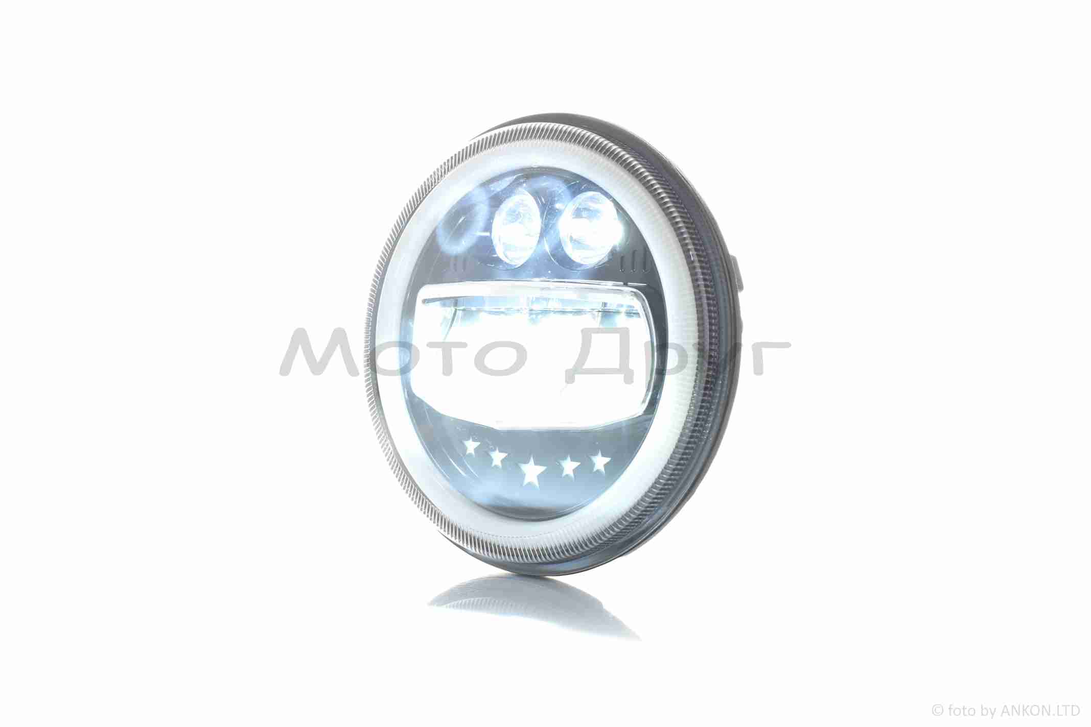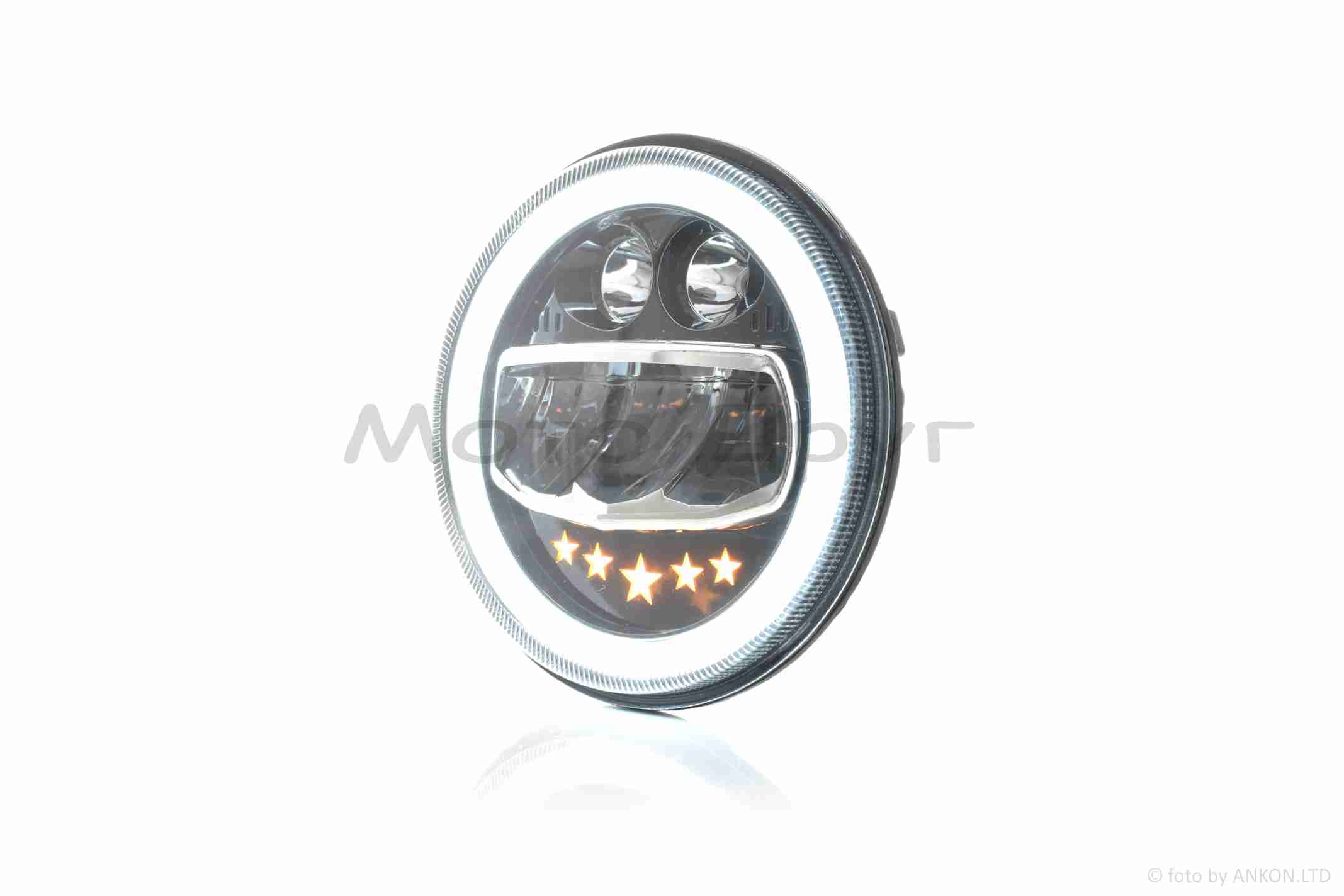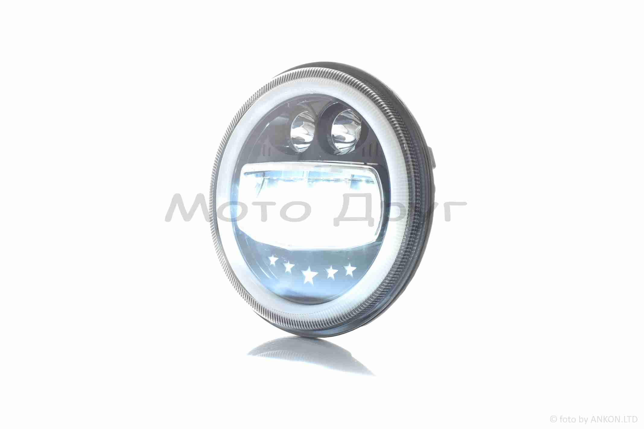Фара мото диодная, круглая, D177, H4, 2 габарита (белый/желтый) #C55-3S1