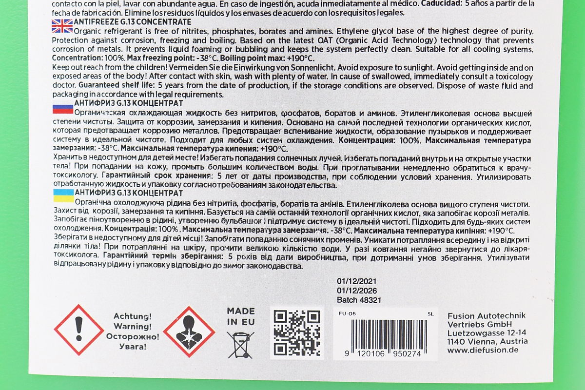Жидкость охлаждающая концентрат -38°C 1:1 “АНТИФРИЗ G13”, зеленая 5L