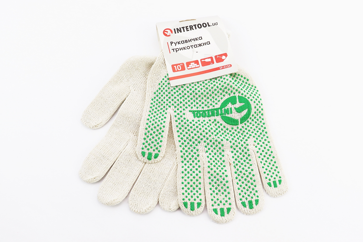 Перчатки рабочие 70% хлопок/30% полиэстер 10″, класс вязки 10, белый, зеленая ПВХ точка SP-0133